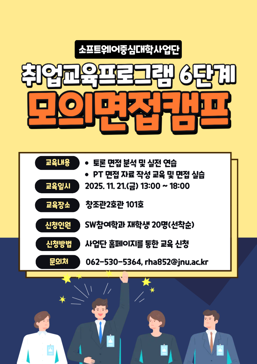 - 신청방법: 사업단 홈페이지 > 교육신청 > 취업교육프로그램 6단계: 모의면접캠프 신청