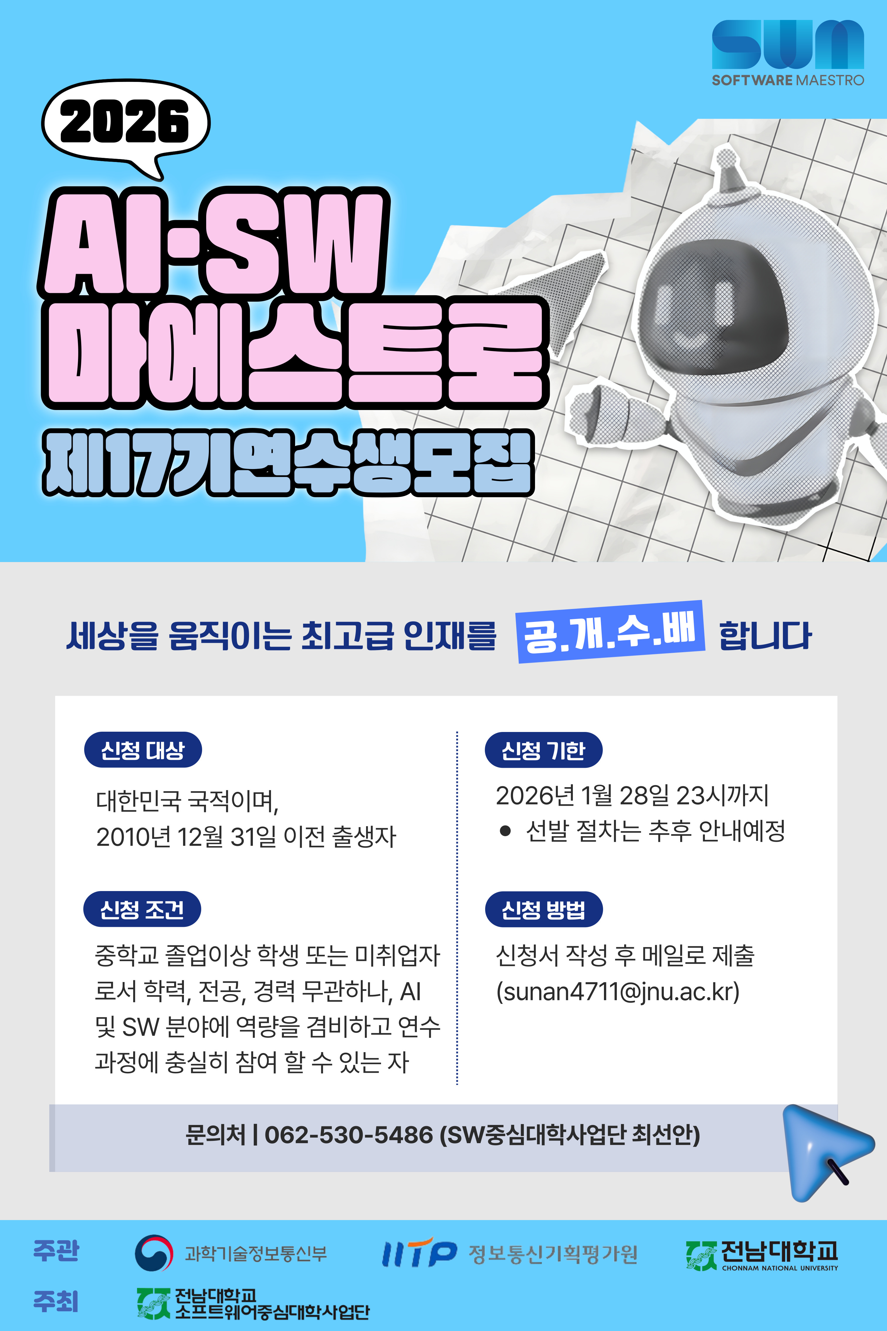 과학기술정보통신부와 정보통신기획평가원에서는 미래를 선도할 AI•SW 혁신인재 양성을 위해 2026년도 『AI·SW마에스트로』 제17기 연수생 선발을 공고합니다.